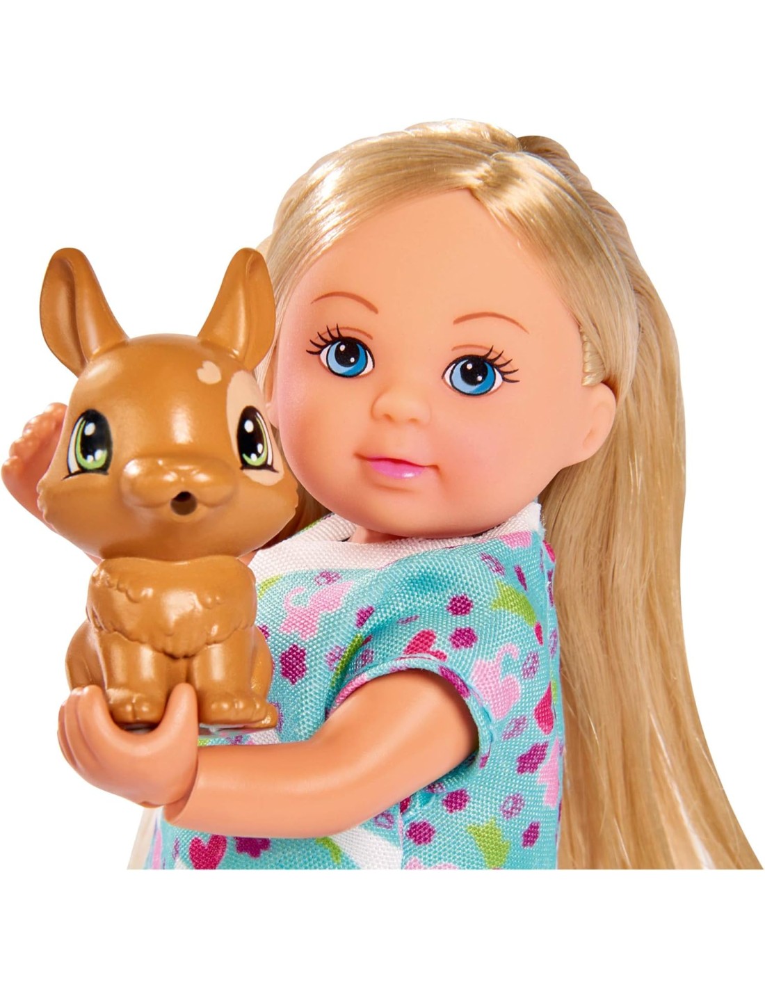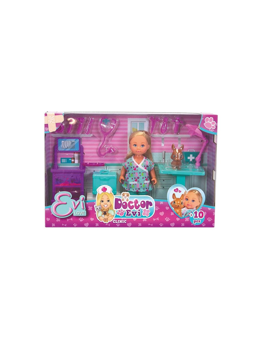 Este set incluye una muñeca evi de 12 cm, una mesa de operaciones, una unidad médica especial para animales y un conejito de mascota