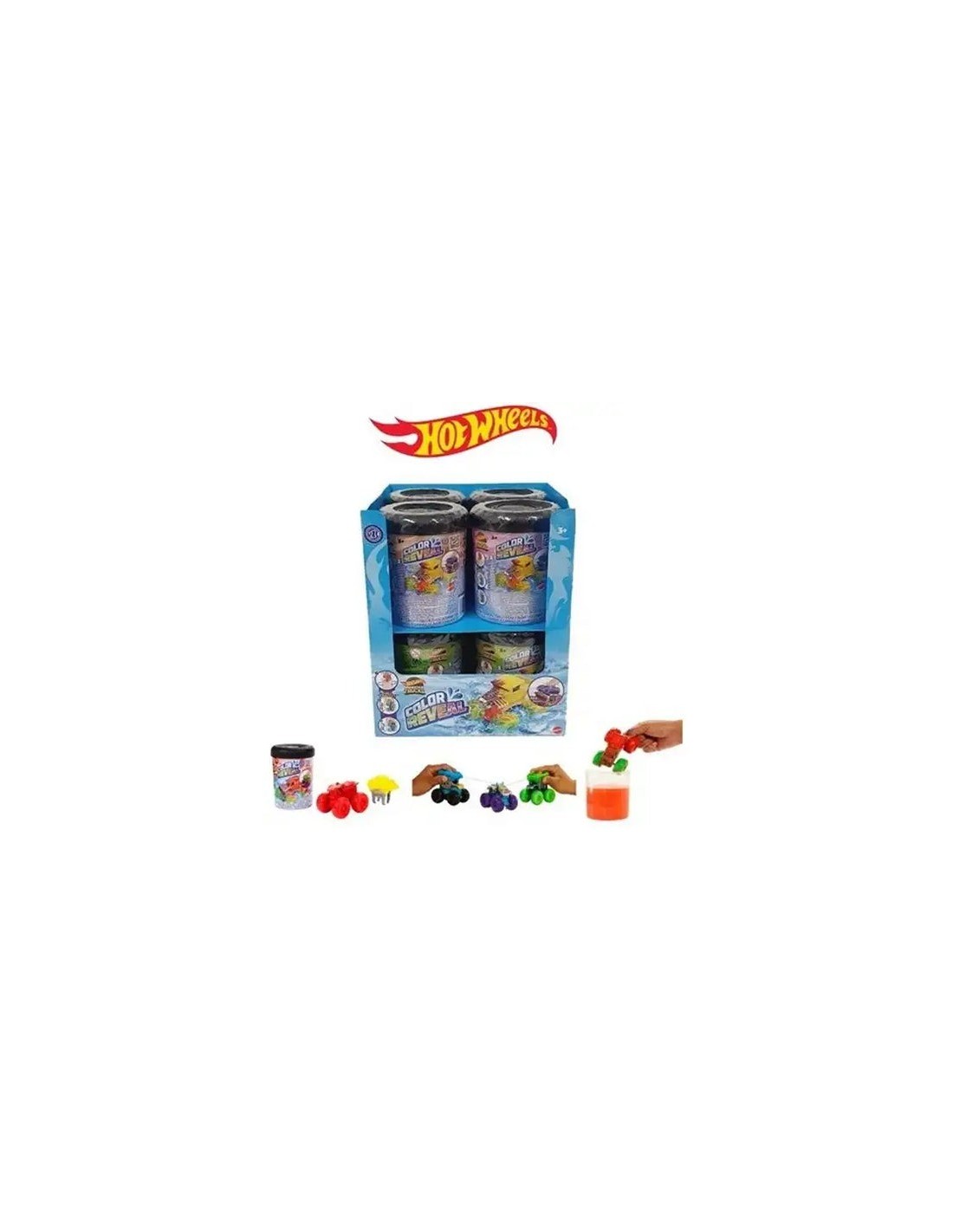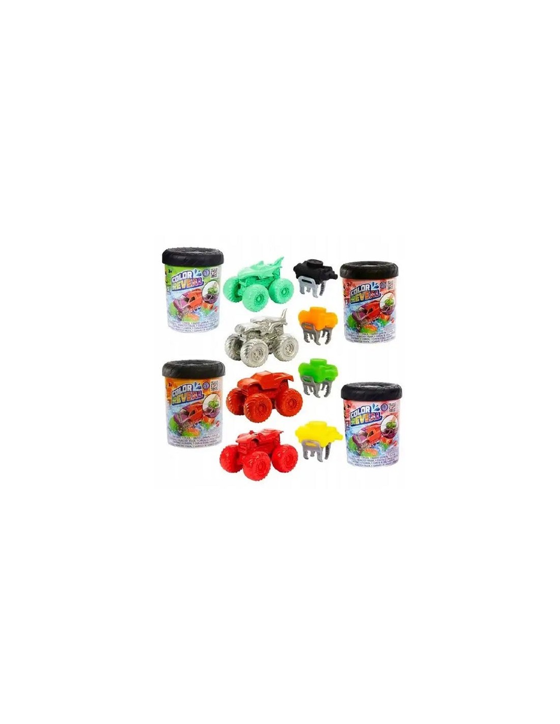 Dentro de cada tambor se encuentra un camión Hot Wheels Color Shifters Monster Truck a escala 1:64 que cuenta con un revestimiento especial Color Reveal y un depósito de agua con broche.